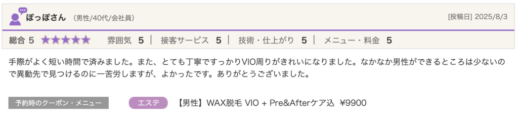 先日、ブラジリアンワックスでご来店いただいた男性のお客様からホットペッパービューティの口コミを投稿していただきました!