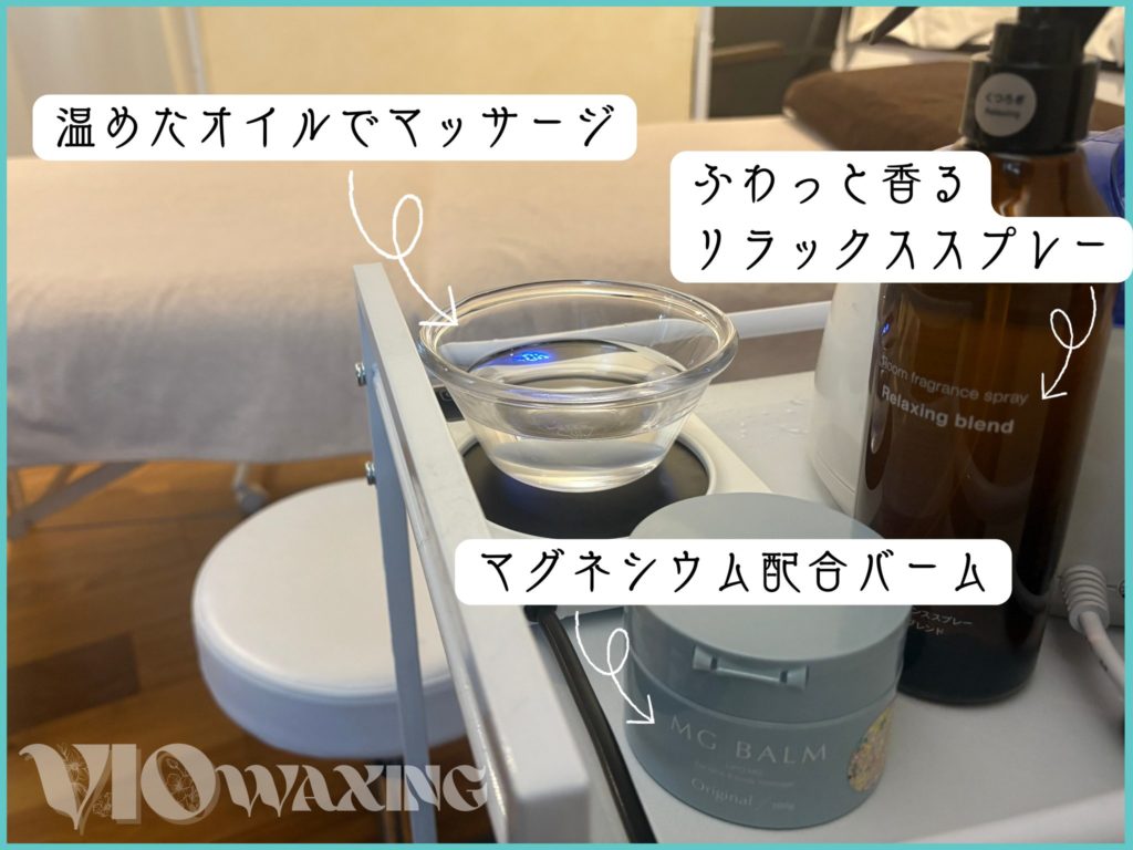 マッサージは、カップウォーマーで温めたオイルを使って進めていきます。